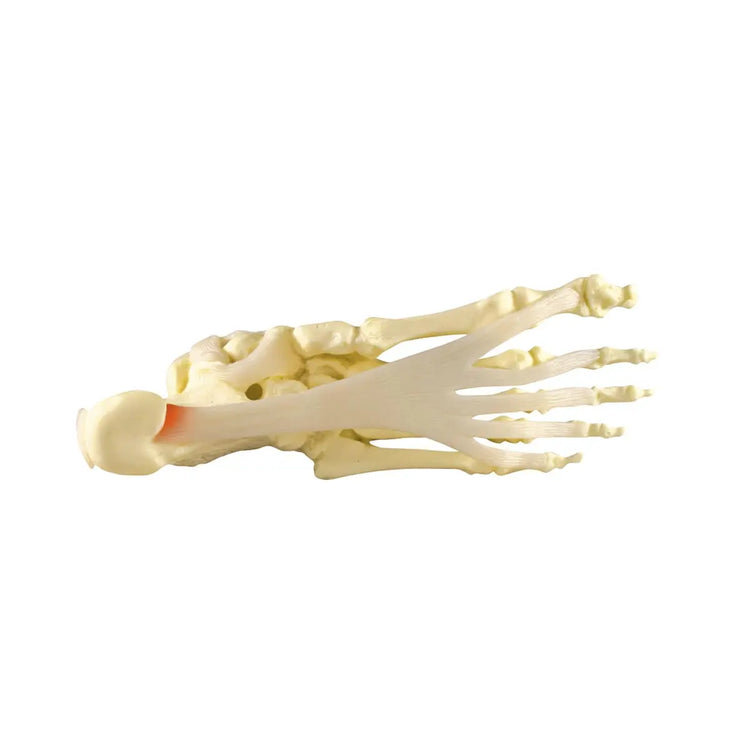 Ce modèle de fasciite plantaire – pied/cheville est un moulage solide grandeur nature des os de la cheville et du pied et représente le ligament (ressort) calcanéonaviculaire plantaire avec une fasciite plantaire. L’anatomie du pied et de la cheville comprend aussi les éléments suivants : tibia, fibula, calcanéum, tendon calcanéen (d’Achille), ligament deltoïde, ligament latéral (collatéral), aponévrose plantaire, cunéiforme, phalanges, os cuboïde, naviculaire, et métatarsien.